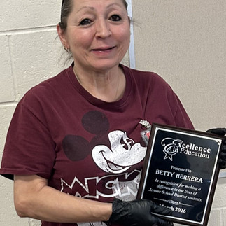 The Excellence in Education Award program began in 2016 and continues through the 2025-2026 school year and has recognized the district’s outstanding teachers and classified staff each month, for a full list of award recipients contact the district office. The Jerome School District presents each recipient a plaque with a $50 gift card provided by Jiffy Lube/Burton Group at the monthly school board meetings.